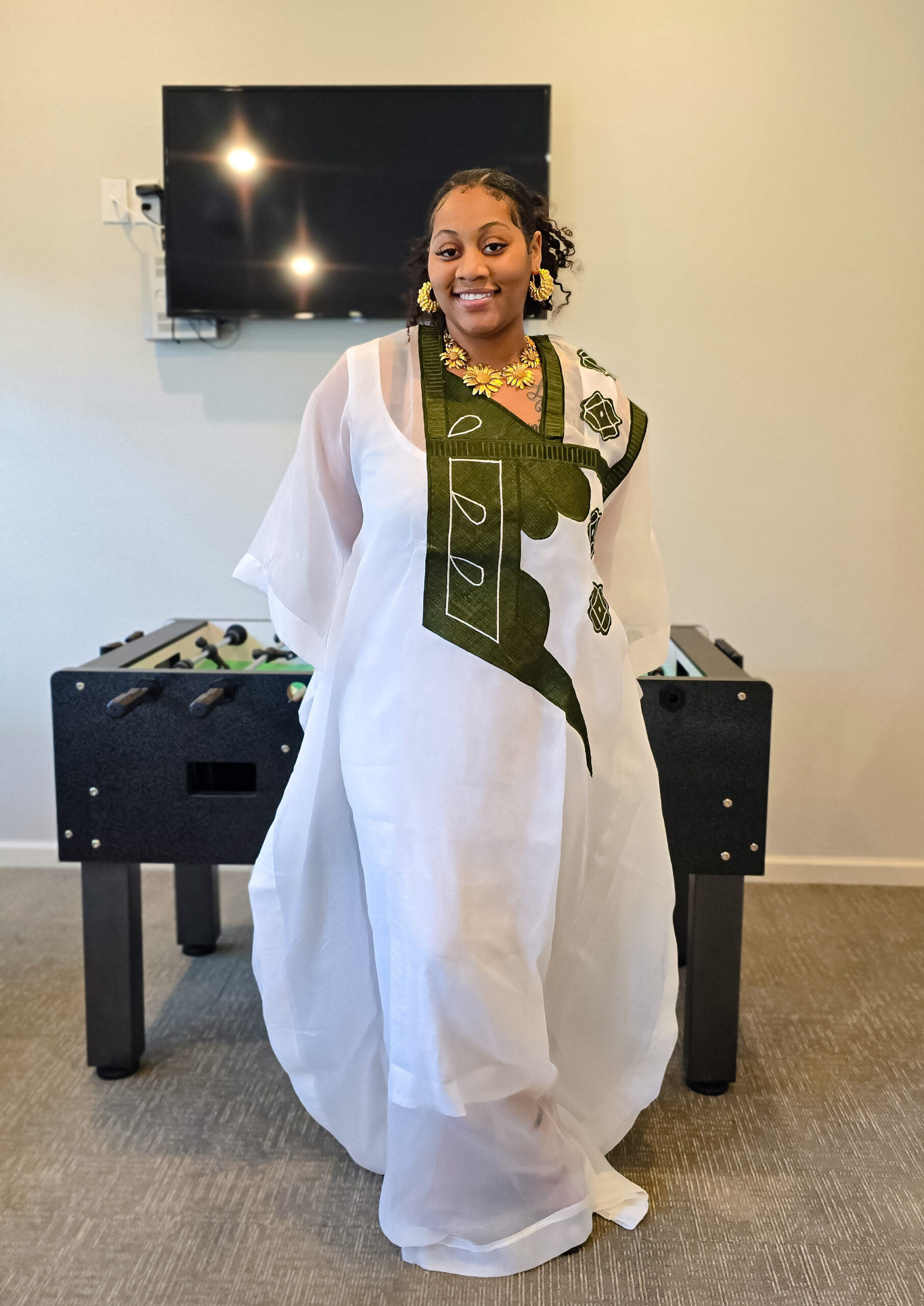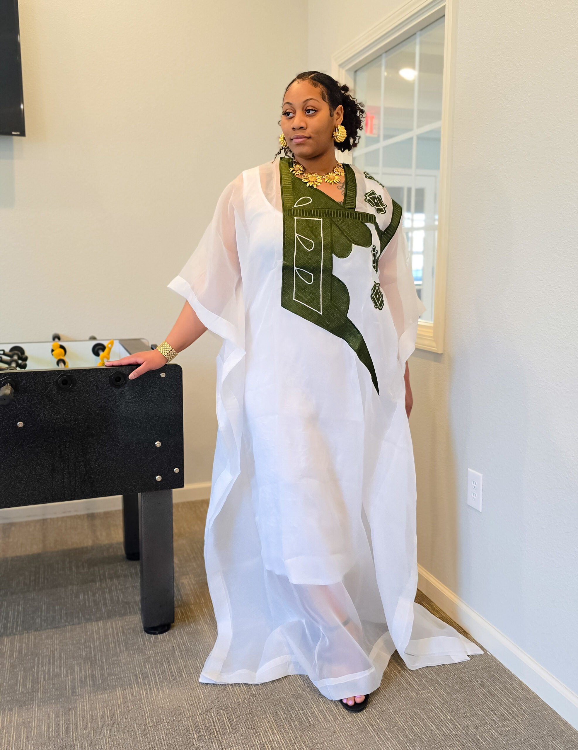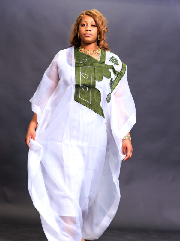 Designed for all body sizes, this full-length kaftan drapes effortlessly, exuding sophistication and grace. The stunning army-green embroidery adds a bold contrast, making this piece truly stand out.